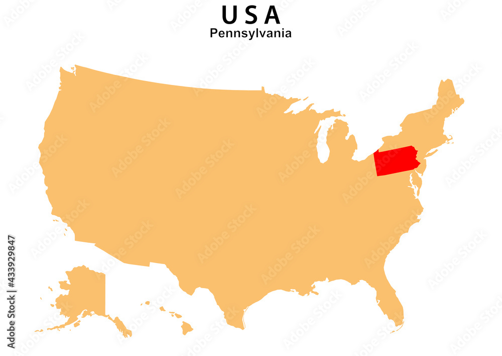 Pennsylvania State map highlighted on USA map. Pennsylvania map on